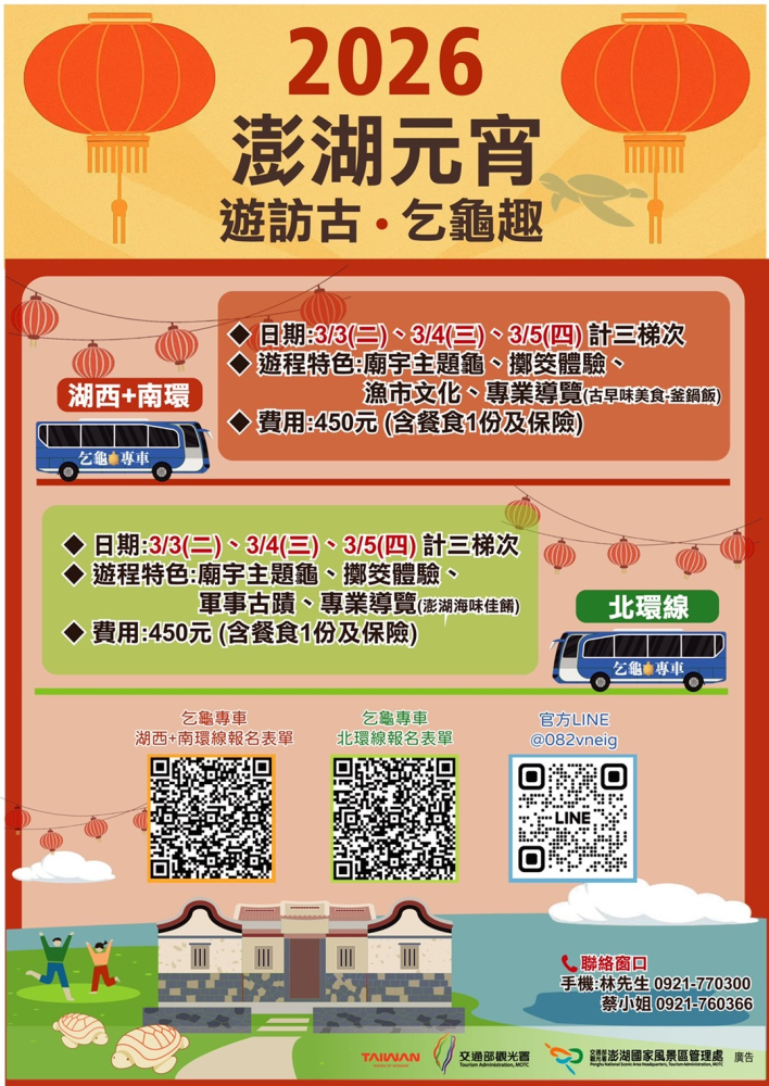 相關活動資訊、報名方式及詳細行程內容,將陸續公布於澎管處官方網站及粉絲專頁,一同來澎湖感受全臺獨一無二的元宵乞龜文化魅力。
