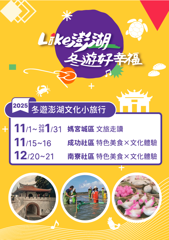 為推動冬季旅遊,澎湖縣政府將於114年11月1日至115年1月31日推出「2025冬遊澎湖消費券」方案,並規劃多元特色活動。其中特別與成功社區合作,於11月15日(六)及16日(日)舉辦兩天四場次的「成功尋野季」,帶領旅客體驗澎湖在地文化魅力。