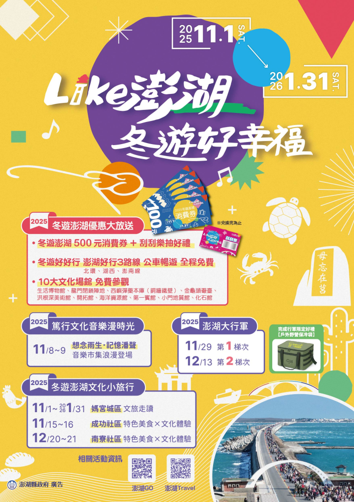 為促進澎湖冬季觀光,2025年11月1日起至2026年1月31日止推出「2025冬遊澎湖消費券」活動,每張消費券面額等同新臺幣100元,印製37萬5,000張,總值3,750萬元整。