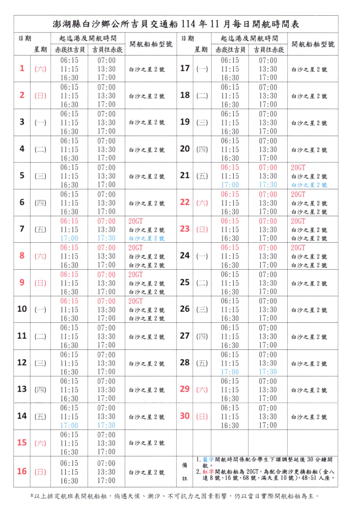 📣白沙之星2號-吉貝交通船114年11月每日開航時間表公告(114年10月28日更新)