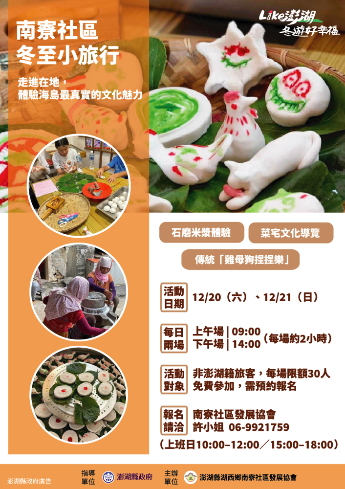 活動於12月20日、21日兩天,每日分上、下午兩場(上午9時及下午2時各一場),每場約2小時,限額30人,免費參加,採預約報名,額滿為止。本次活動特別開放給非澎湖籍旅客(報到時須出示身分證),讓外地朋友能親身感受澎湖冬至民俗的節慶氛圍,並深入體驗社區的人文風貌與永續智慧。報名請於上班時間(上班日10:00-12:00;15:00-18:00)洽南寮社區發展協會許小姐,電話:06-9921759。