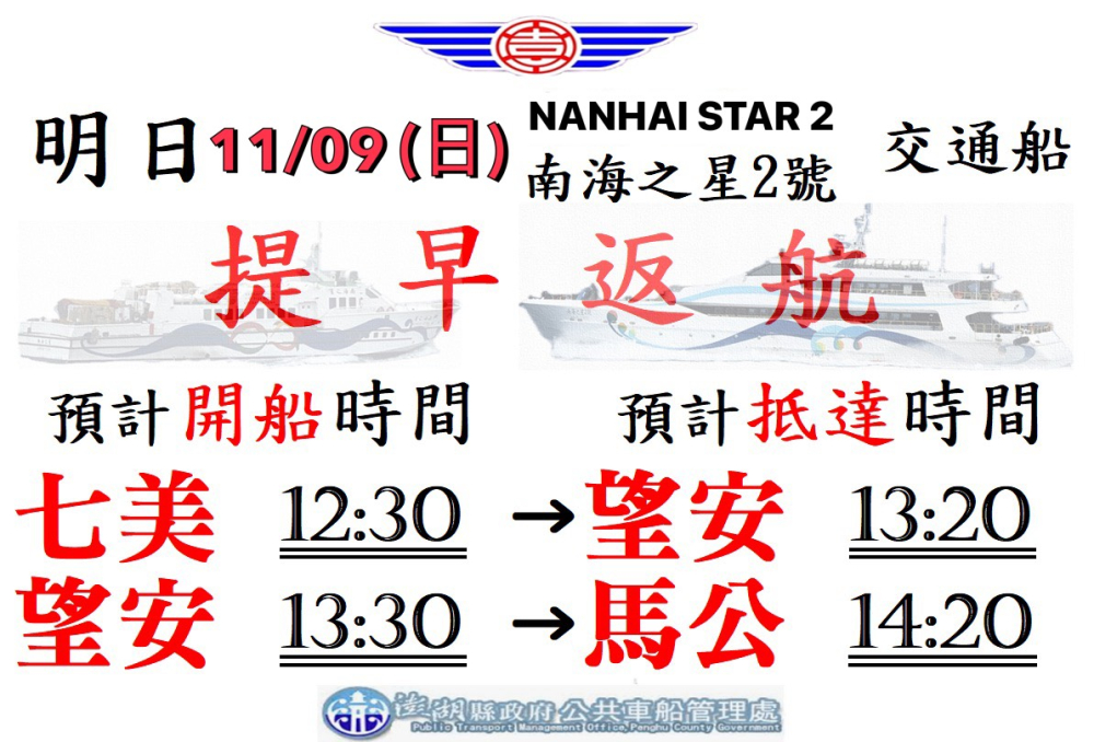 明日11/09(日) 南海之星 2號 交通船 一一下午風浪增強,提早返航一一