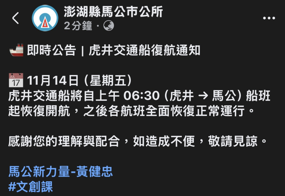 即時公告|虎井交通船復航通知
