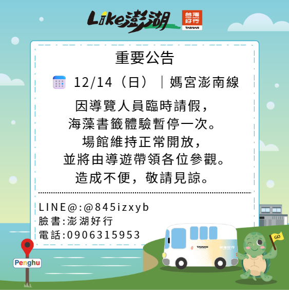 因應水產種苗繁殖場 12/14(日) 導覽人員人力調整, 👉 媽宮澎南線「海藻書籤體驗」將暫停一次, 當日僅開放場館導覽。 造成不便,敬請見諒 🙏🌿 |客服專線:0906315953| |官方 LINE:@845izxyb|
