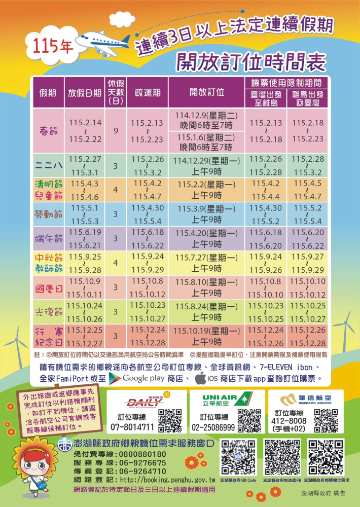 為協助鄉親掌握返鄉與旅遊機位,縣府提供 115 年連續 3 日以上連續假期離島航線開放訂位時間表墊板,即日起於澎湖縣政府警衛室開放索取(數量有限)。