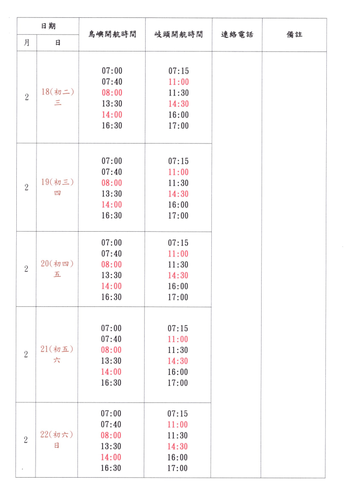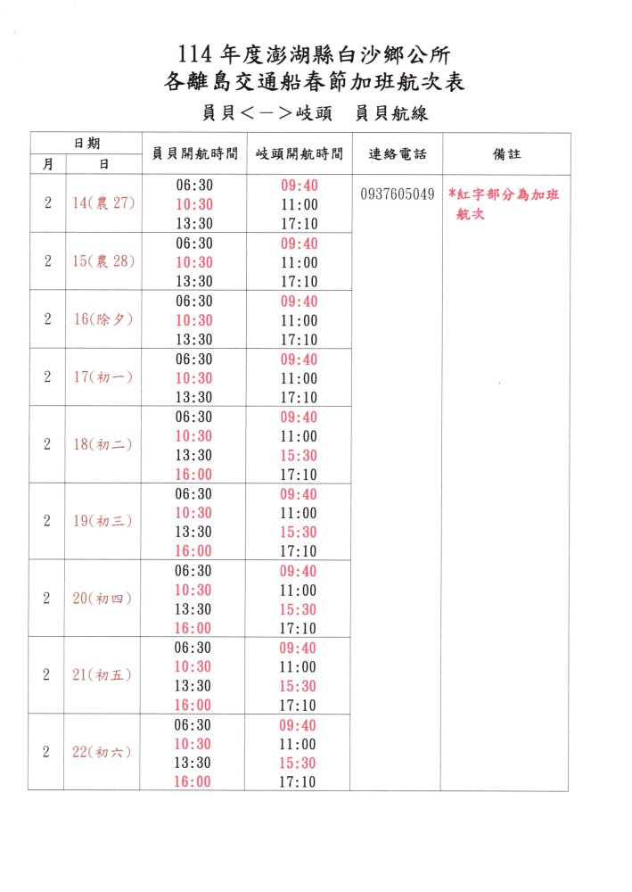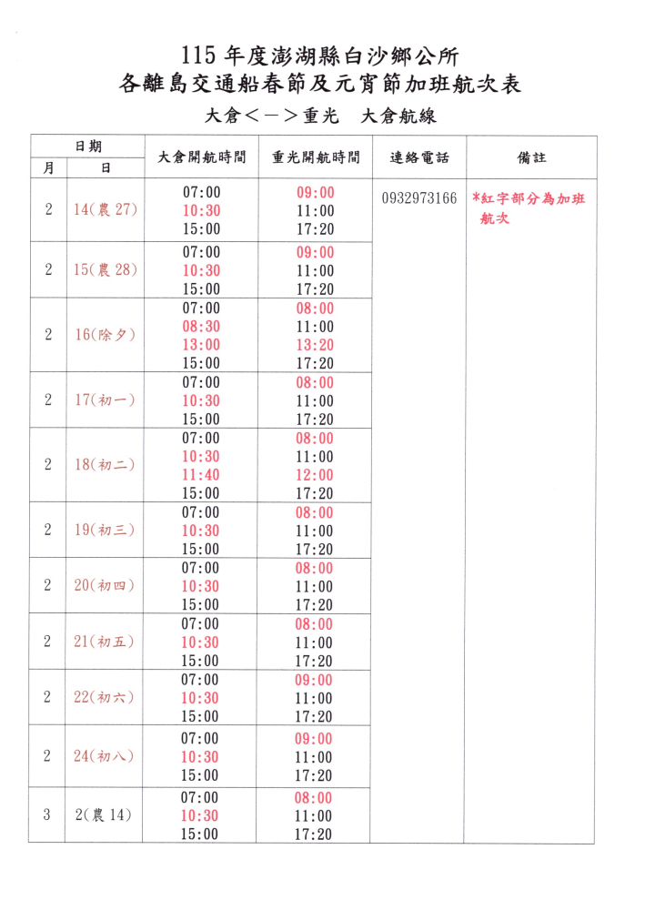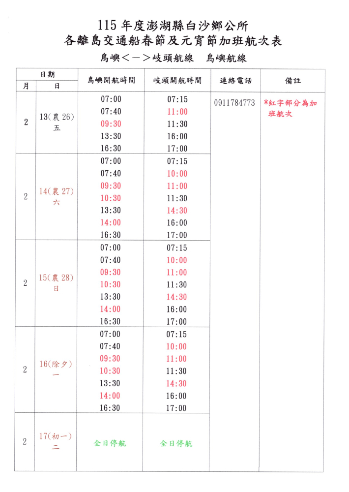公告: 115年白沙鄉春節(2月13至3月3日)離島加班航班時間表,請各位返鄉鄉親參閱: 請各離島鄉親注意搭乘航班時間。