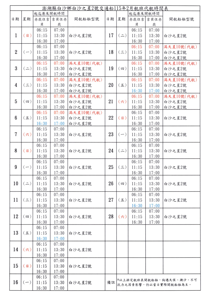 白沙之星2號-吉貝交通船115年2月每日開航時間表公告(115年1月28日更新) #請離島鄉親注意開航時間