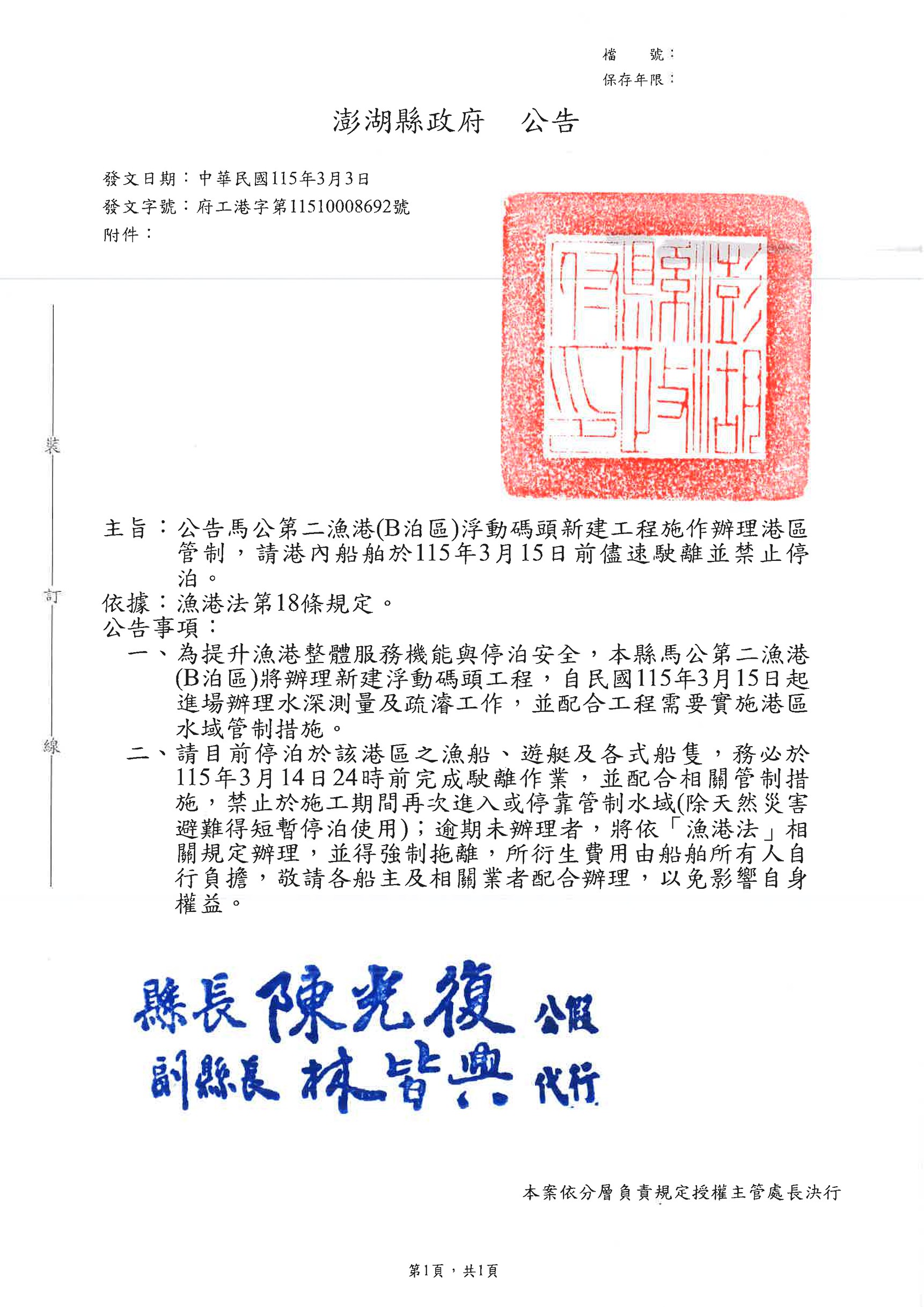 主旨:公告馬公第二漁港(B泊區)浮動碼頭新建工程施作辦理港區管制,請港內船舶於115年3月15日前儘速駛離並禁止停泊。 依據:漁港法第18條規定。 公告事項: 一、為提升漁港整體服務機能與停泊安全,本縣馬公第二漁港(B泊區)將辦理新建浮動碼頭工程,自民國115年3月15日起進場辦理水深測量及疏濬工作,並配合工程需要實施港區水域管制措施。 二、請目前停泊於該港區之漁船、遊艇及各式船隻,務必於115年3月14日24時前完成駛離作業,並配合相關管制措施,禁止於施工期間再次進入或停靠管制水域(除天然災害避難得短暫停泊使用);逾期未辦理者,將依「漁港法」相關規定辦理,並得強制拖離,所衍生費用由船舶所有人自行負擔,敬請各船主及相關業者配合辦理,以免影響自身權益。連絡電話:澎湖縣政府工務處 06- 9264048
