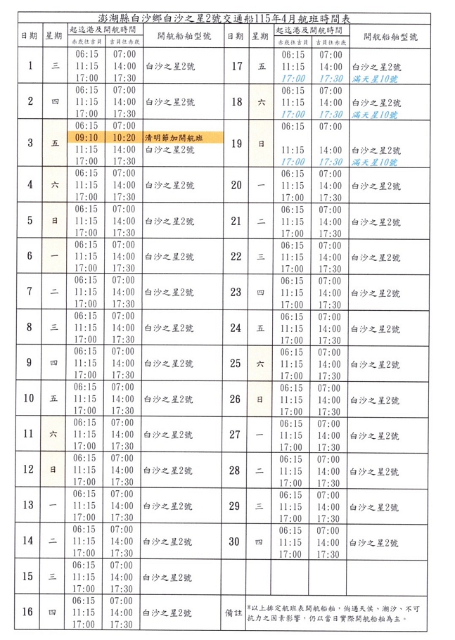 📣白沙之星2號-吉貝交通船115年4月每日開航時間表公告(115年3月20日更新)