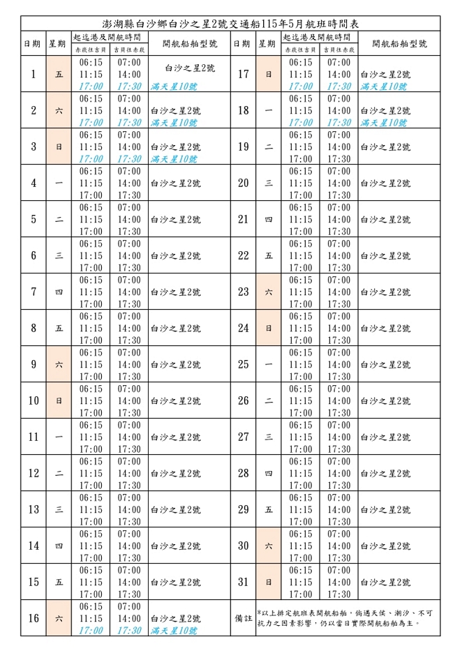 白沙之星2號-吉貝交通船115年5月每日開航時間表公告(115年4月23日更新)