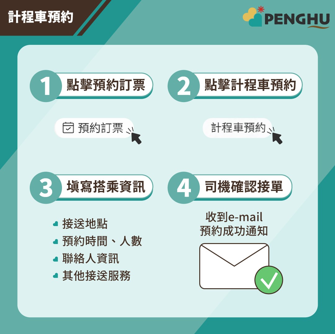 「預約訂票」功能主要包含交通船購票、景點場館預約、計程車機場港口接送、台灣好行觀光公車預約等預約服務,方便您安排在澎湖的旅遊行程