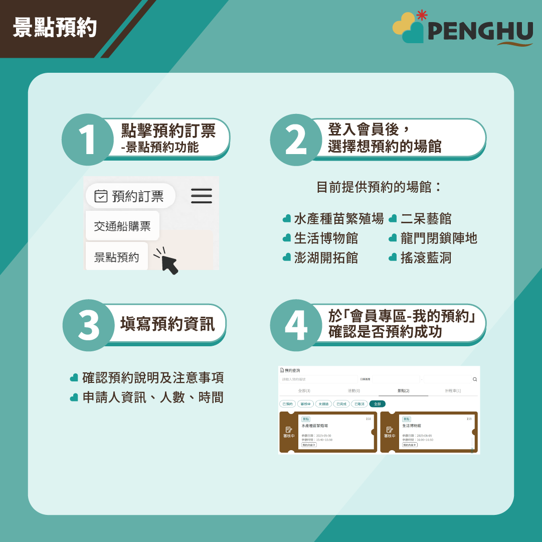 (2)若預約成功但未收到E-mail通知信件,可使用「客服信箱:service@penghu-go.tw」或「LINE官方帳號:@090pquk」詢問。