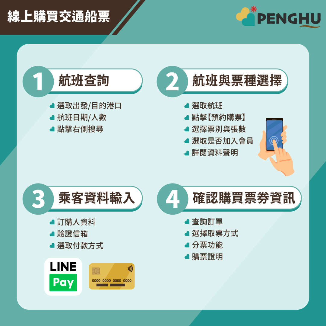 您可使用「預約訂票」功能,預約交通船、景點、計程車及澎湖好行套票服務。